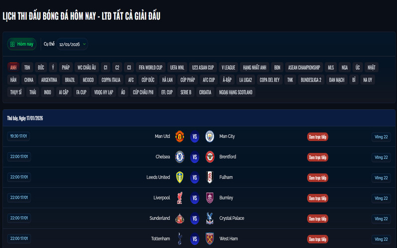Trong giao diện lịch thi đấu, chúng tôi cho phép người dùng lựa chọn từng giải đấu cụ thể. Bạn chỉ cần chọn Ngoại hạng Anh để hệ thống hiển thị đúng các trận đấu thuộc Premier League, giúp tiết kiệm thời gian và tránh bị rối bởi các giải đấu khác.